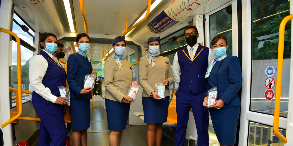 Air Mauritius is proud to be serving our wonderful nation and to celebrate Independence Day, a campaign, under the theme of ‘Proudly Mauritian’, was launched along with a train wrapping ceremony in collaboration with Metro Express Mauritius. Incoming passengers were welcomed by our Cabin Crew members with an Air Mauritius complimentary sanitary kit.