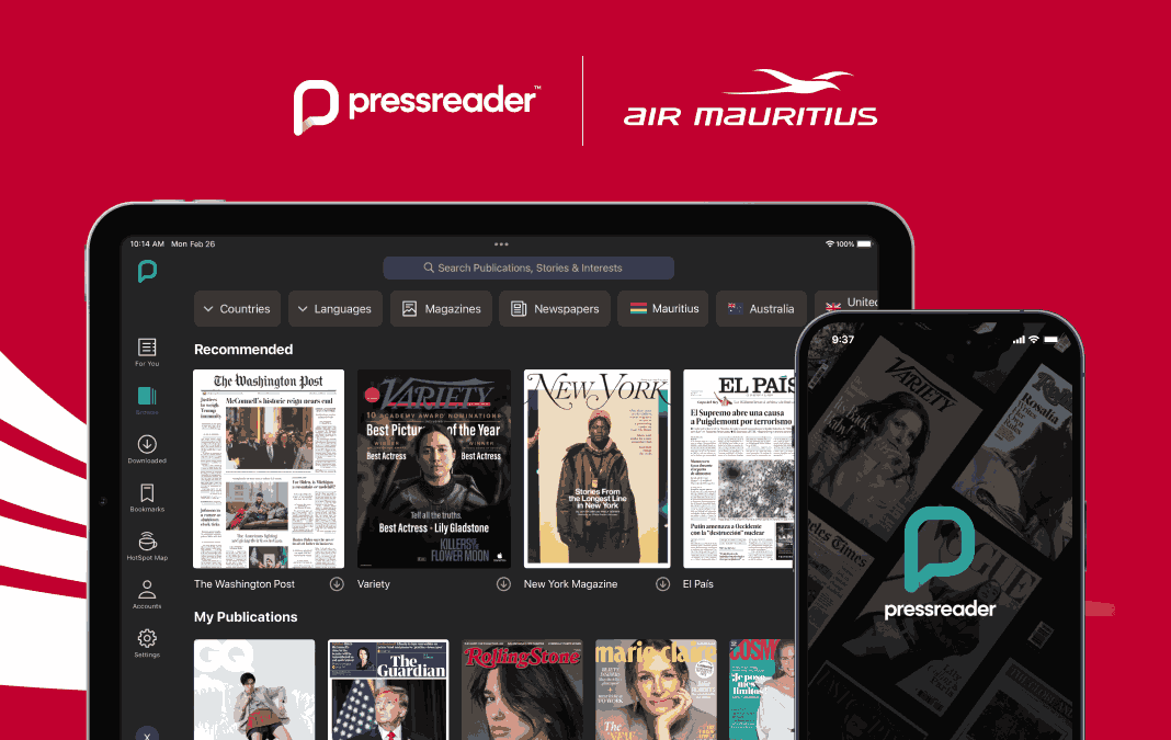 Dive into a world of reading with PressReader, where you have access to 7,000+ global newspapers and magazines on your device. With PressReader, you can search, download, and read publications right from your own device before, during and after your flight.